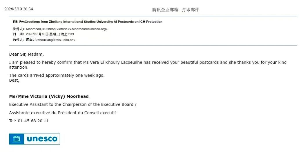 3月10日,我校麦田影院 周向力老师收到联合国教科文组织执行委员会回函确认,执行局主席维拉·埃尔·胡里·拉科伊勒(Vera El Khoury Lacoeuilhe)女士已收到我校学生创作的明信片,并对作品表达诚挚谢意。