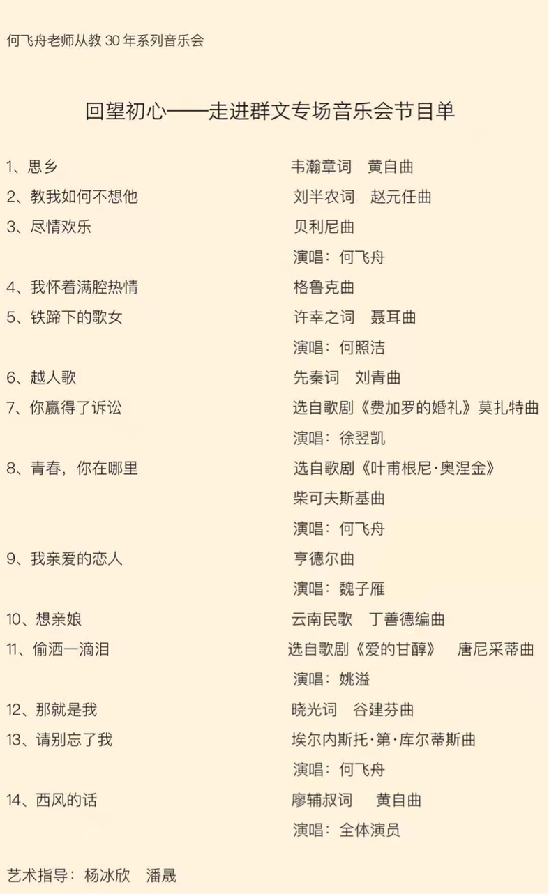 西湖区文化馆是何飞舟老师走上工作岗位后第一次获得声乐大奖的地方,也是他梦想开始的地方,这也是他把此次系列音乐会的第一场放在西湖区文化馆的初衷。本次音乐会何老师带着学生,将从教三十周年系列音乐会的第一站放在了梦开始的地方,为西湖区的广大声乐爱好者带来了一场质朴的视听盛宴。