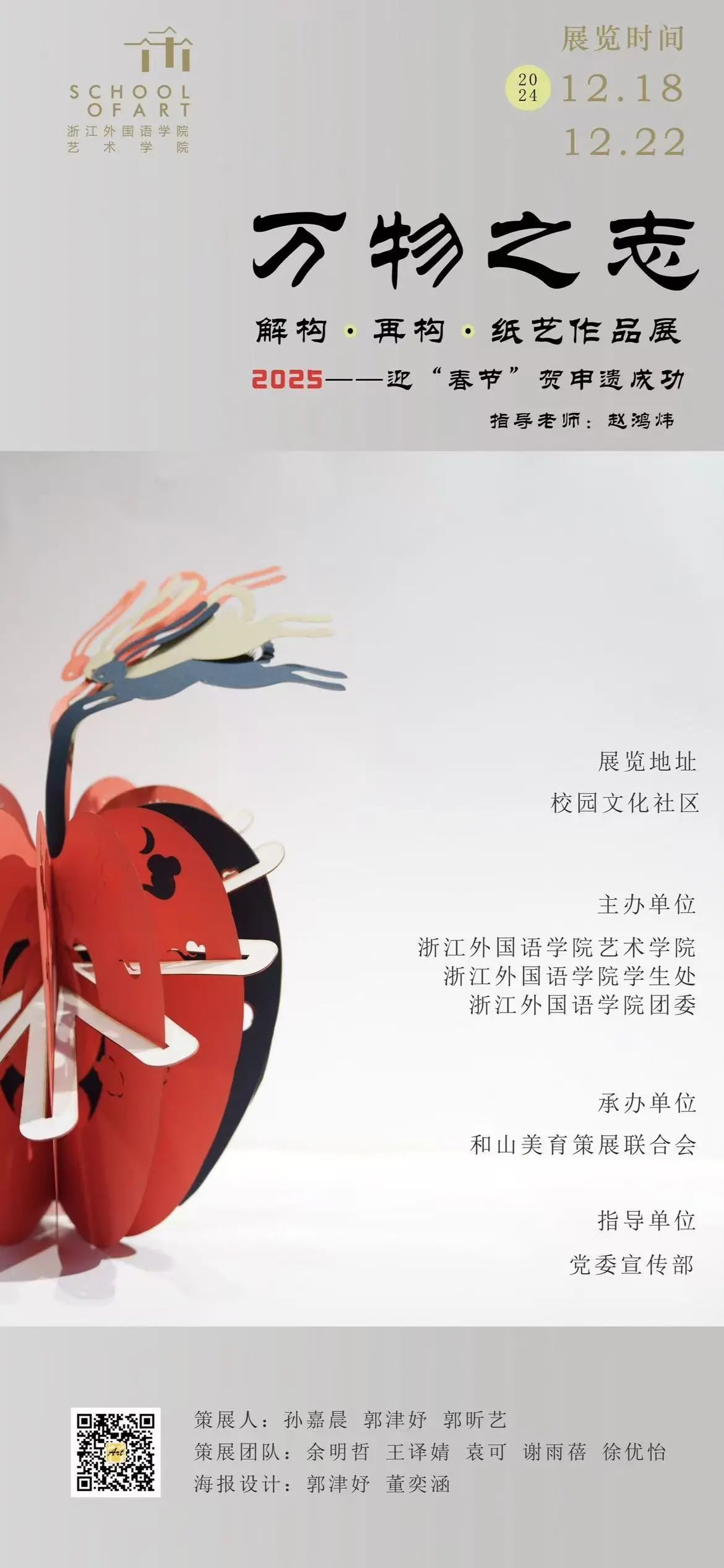 2024年12月18日,“迎春节,贺申遗成功——‘万物之志’解构·再构·纸艺作品展”隆重开幕。本次展览汇集了“艺术与科技”产品方向大一、大二学生在三维与纸艺课程中的课堂习作,以及指导教师的案例教学作品。展览以“解构与再构”为核心,通过纸艺这一传统媒介的创新运用,展现自然元素与艺术设计的深度融合。