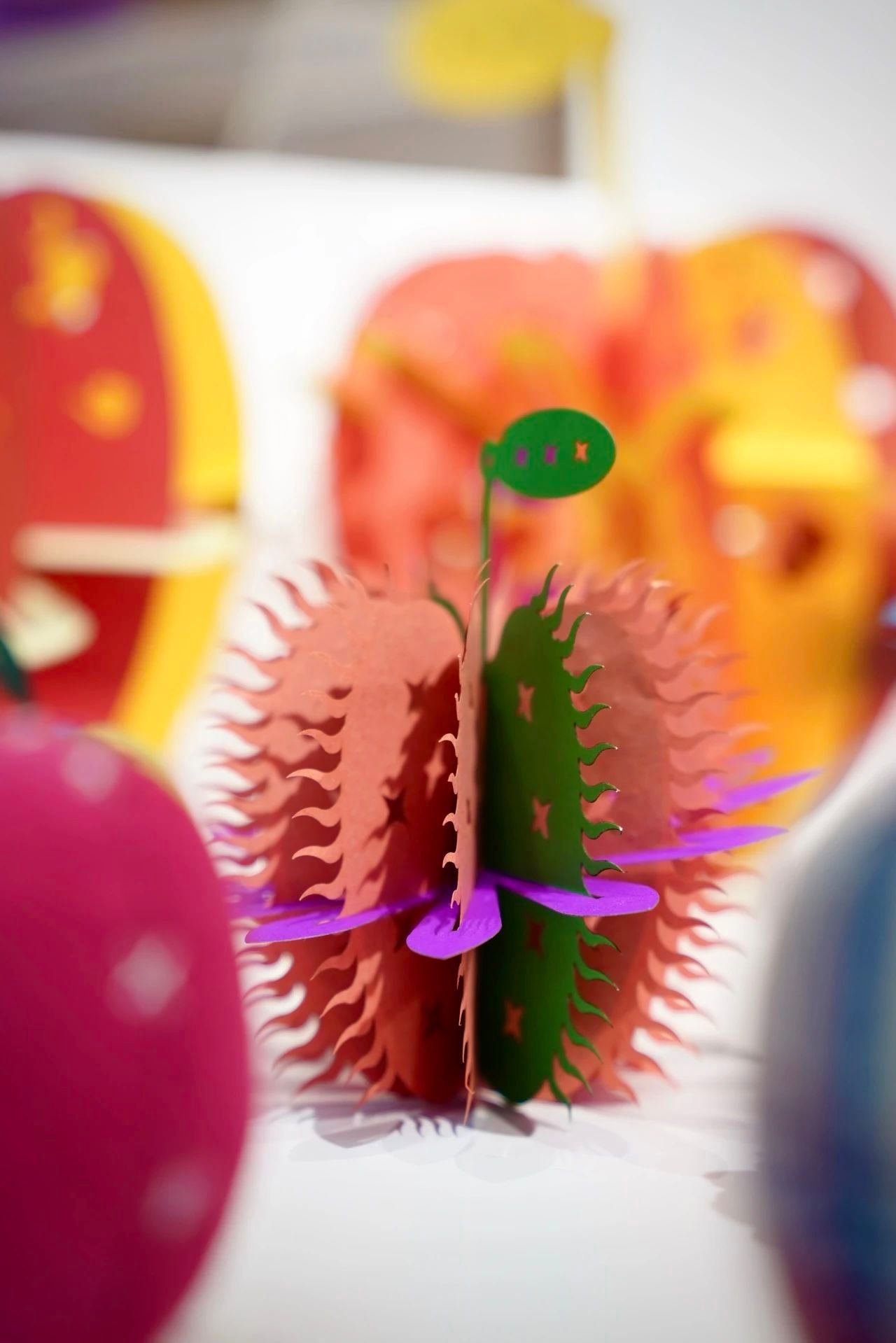 本次的展出作品是艺术与科技产品方向大一和大二学生三维与纸艺课程的课堂习作 ,包括指导老师的案例教学作品。从自然元素中寻找灵感,进行解构与再构,学习纸艺的技法进行艺术设计,如镂空技法、折叠法、叠色法、插合法、非遗纸翻花工艺法等。深入探寻纸再造的美学本质,呈现纸艺的艺术美感。